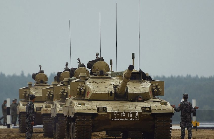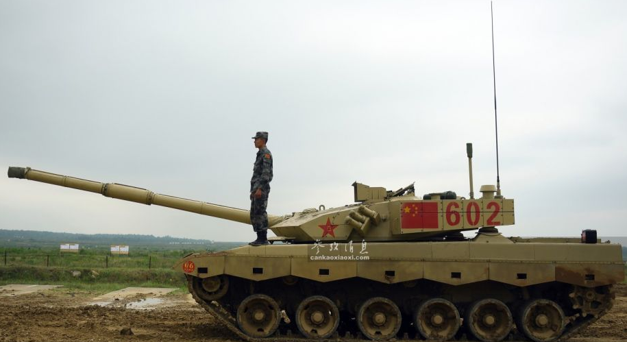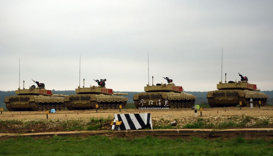 俄軍相關人士指出,中國隊是此次比賽中的“奪冠熱門”。”側面拍攝的602號96B坦克。96B配備有一門125毫米滑膛炮,具備發射炮射反坦克導彈能力。