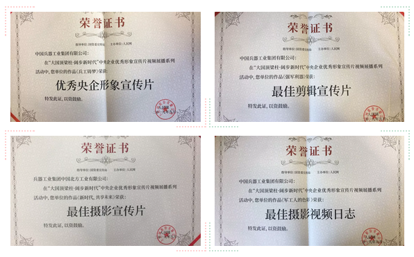 本次展播活動分設形象宣傳片、員工視頻日志兩個賽道,從中央企業報送的2600余部作品中,評選出了“優秀央企形象宣傳片”、“最具大國精神宣傳片”和“央企員工優秀視頻日志”等十二個種類、120部優秀作品,中國兵器工業集團4部作品獲獎。