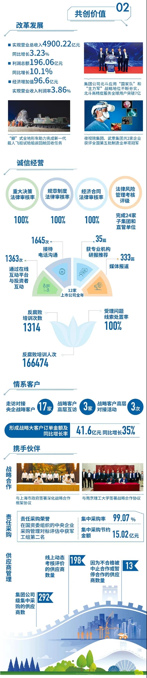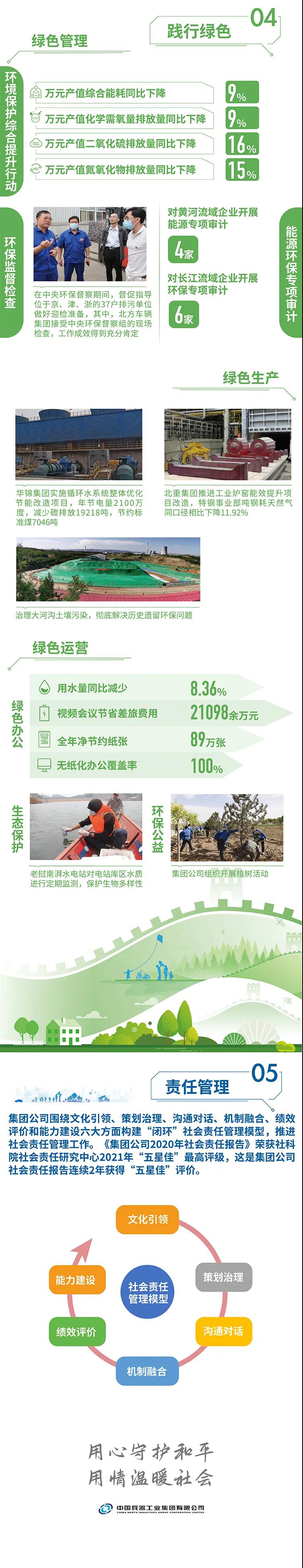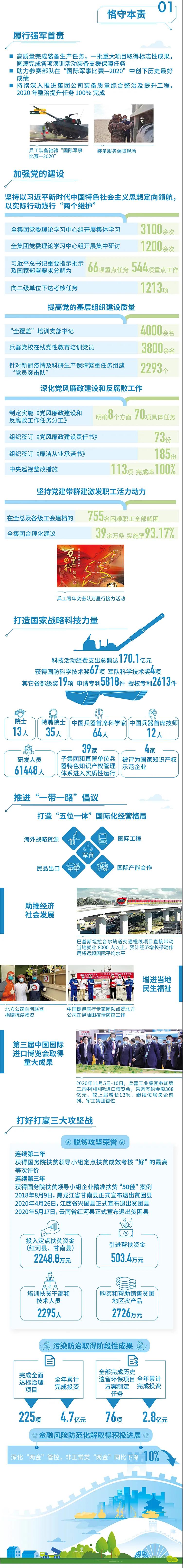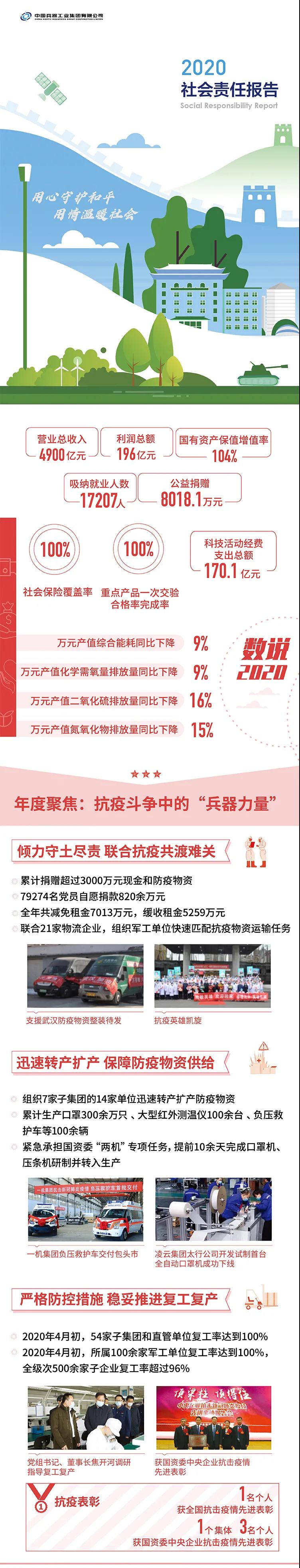 2020年,是“十三五”規(guī)劃收官之年,也是全面建成小康社會、實現(xiàn)第一個百年目標的決勝之年。集團公司黨組書記、董事長焦開河在報告開篇指出,集團公司實現(xiàn)了“十三五”圓滿收官,整體步入了高質量發(fā)展軌道,呈現(xiàn)出基礎更牢、動力更強、空間更大、效能更高的積極向上良好態(tài)勢。在“十三五”特別是近三年來的工作實踐中,我們明確了“集團公司是國家安全和國防建設的脊梁、是國家戰(zhàn)略科技力量最為重要的組成部分、是黨和國家最可信賴的‘六個力量’,肩負著支撐國防軍隊建設、推動科技自立自強、服務構建新發(fā)展格局的重大政治責任和光榮使命,具有極強的政治屬性,性質特殊、使命特殊、責任特殊”的新時代新階段職責使命,深化了對“堅持以習近平新時代中國特色社會主義思想定向領航,是集團公司高質量發(fā)展的根本遵循;保持貫徹落實習近平總書記重要指示批示和黨中央決策部署的戰(zhàn)略定力,是集團公司高質量發(fā)展的根本前提;履行好強軍這個首要職責,是集團公司高質量發(fā)展的根本要求;加快兵器科技創(chuàng)新突破,是集團公司高質量發(fā)展的根本支撐;加強黨的領導黨的建設,是集團公司高質量發(fā)展的根本保證”的兵器工業(yè)改革發(fā)展規(guī)律認識。 《報告》聚焦“抗疫斗爭中的‘兵器力量’”,生動展示了集團公司抗擊疫情的有力行動,展現(xiàn)了集中力量辦大事、急國家之所急的“兵器速度”,彰顯了“把一切獻給黨”的人民兵工精神和貫徹落實國家決策部署的責任擔當?!秷蟾妗芬浴坝眯氖睾蚝推健⒂们闇嘏鐣睘橹黝},從恪守本責、共創(chuàng)價值、致力和諧、踐行綠色、責任管理五個維度,全面展現(xiàn)集團公司在堅持履行政治責任、經濟責任、社會責任,履行強軍首責、加強黨的建設、打造國家戰(zhàn)略科技力量、推進“一帶一路”倡議、打好打贏三大攻堅戰(zhàn)、深化改革、助力員工成長、支持社會公益事業(yè)、提升社會責任管理等方面的生動實踐和履責亮點,凸顯集團公司保持貫徹落實黨中央決策部署的戰(zhàn)略定力、在聚焦主責主業(yè)、科技引領、國際化經營上持續(xù)用力,為實現(xiàn)第一個百年奮斗目標貢獻力量的初心與行動。《報告》再次獲得中國企業(yè)社會責任報告評級專家委員會“五星佳”最高評級,兵器工業(yè)集團成為軍工行業(yè)唯一連續(xù)10年獲得最高評級的企業(yè)。 2021年是開啟新征程的開局之年,也是建黨100周年、人民兵工創(chuàng)建90周年,兵器工業(yè)集團將全面貫徹落實黨中央戰(zhàn)略部署,緊扣推動高質量發(fā)展主題,圍繞“十四五”開好局、起好步,堅決完成黨中央賦予的職責使命,履行好中央企業(yè)和軍工集團的政治責任、經濟責任、社會責任,為實現(xiàn)中國夢強軍夢作出新的更大貢獻! 一圖看懂《中國兵器工業(yè)集團有限公司2020年社會責任報告》