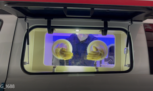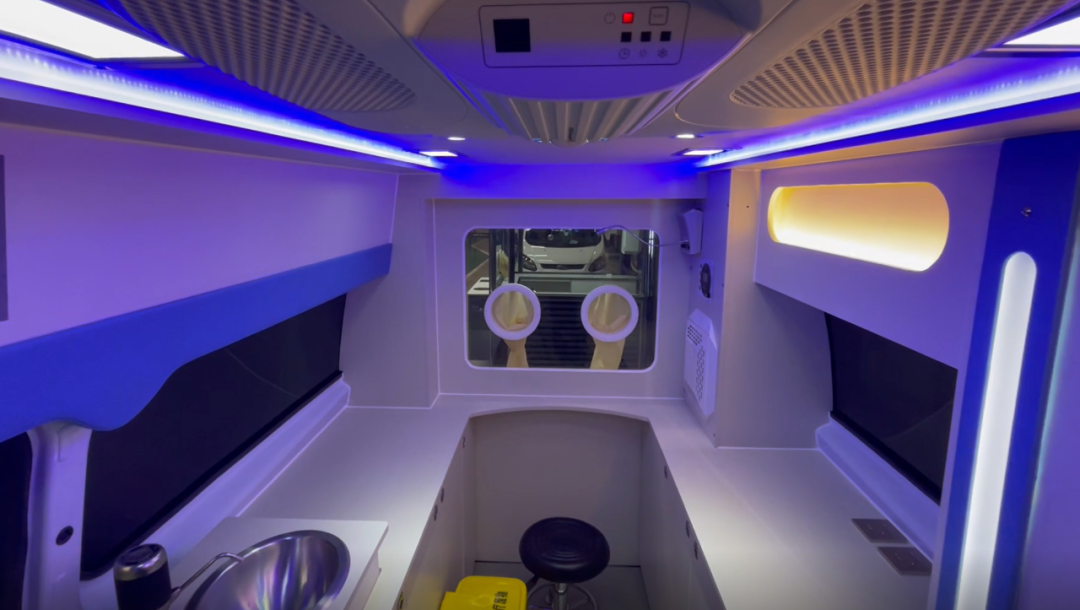核酸采樣車采用福特新全順中軸中頂汽油款底盤,外觀與普通救護車類似,內(nèi)部上裝醫(yī)療輔助系統(tǒng)、空調(diào)系統(tǒng)、照明系統(tǒng)、新風(fēng)過濾系統(tǒng)等。其中,最為核心的醫(yī)療輔助系統(tǒng)包括采樣窗口、隔離手套、車載冰箱、洗手池系統(tǒng)、凈水桶、污水箱、污物桶、車載飲水機等。