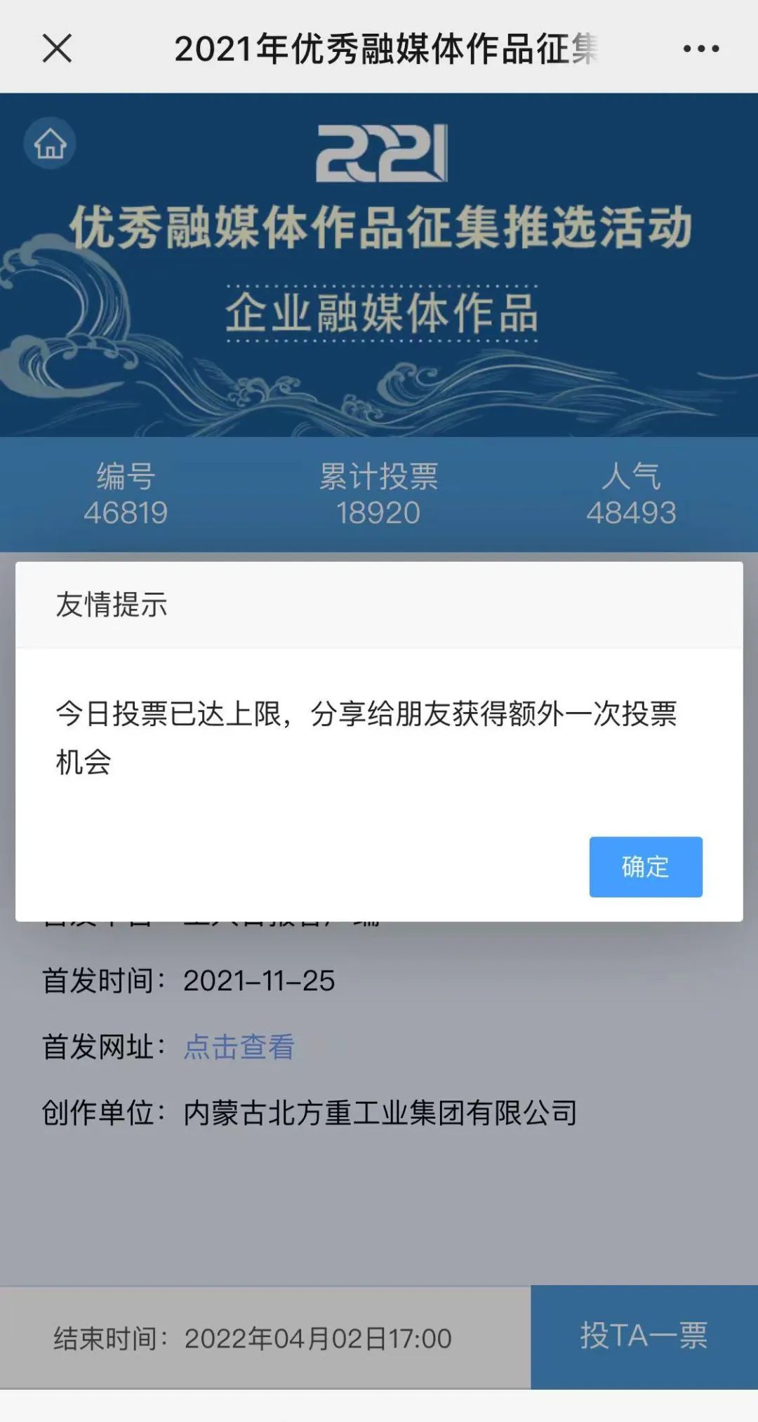 近日,由“文化強國”光明日報協同推廣平臺、光明網、北京師范大學新媒體傳播研究中心和光明天翼5G融媒實驗室共同主辦的“2021年優秀融媒體作品征集推選活動”開啟線上投票環節,經過專家委員會評審,中國兵器工業集團北重集團《白楊伴我獻國防》音樂MV入選活動前二十名,并進入網絡投票環節。