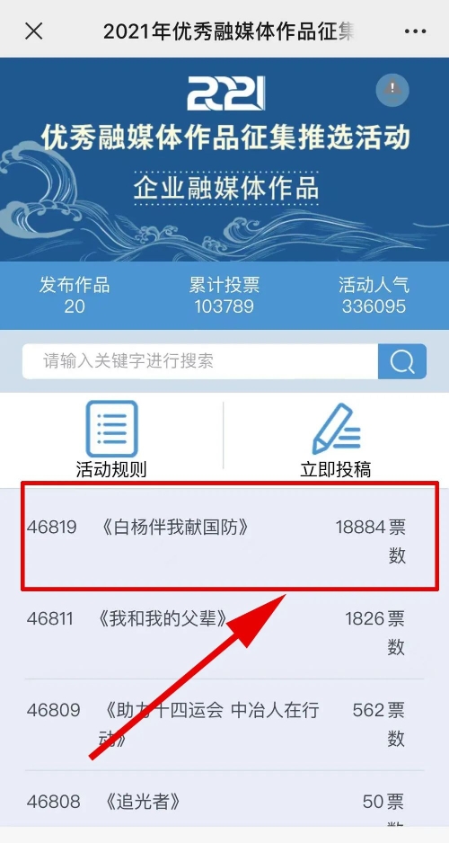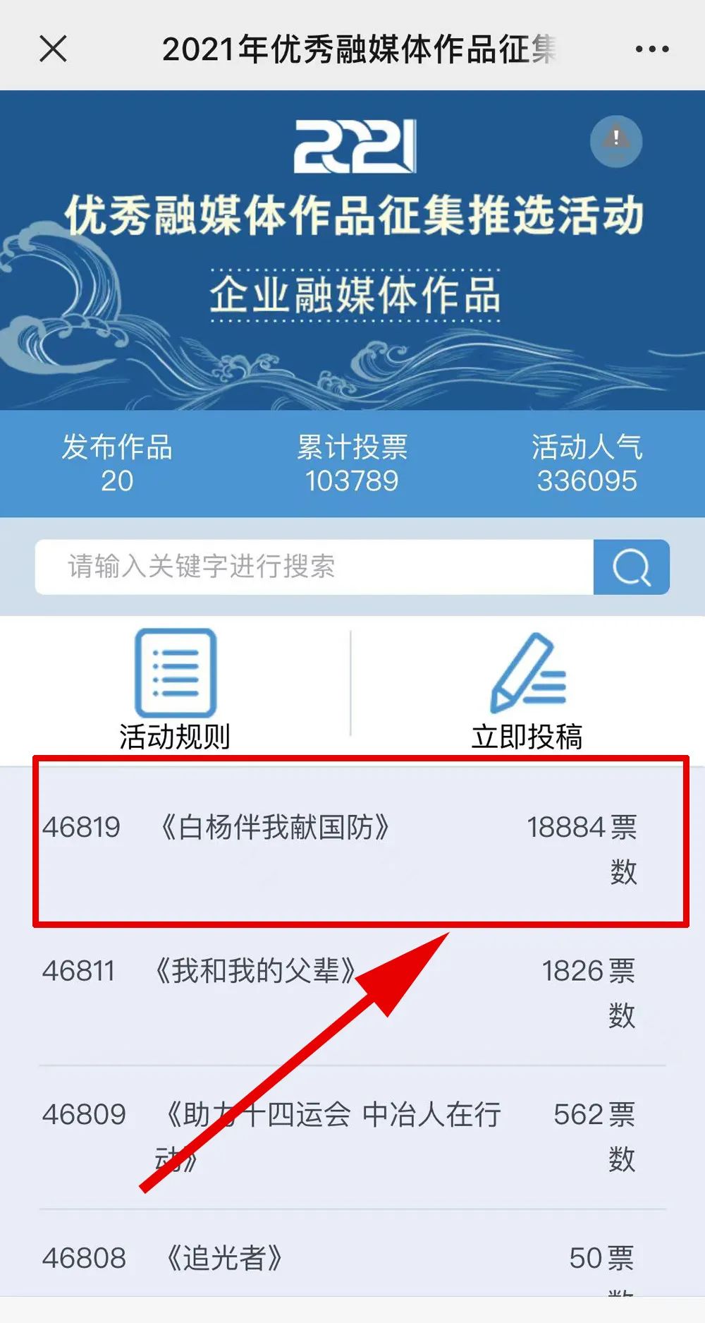 1.掃描下方二維碼,進入初始界面,點擊“企業融媒體作品征集”,進入投票界面點擊《白楊伴我獻國防》,點擊“投TA一票”;