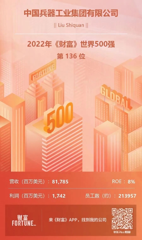 8月3日,《財富》世界500強排行榜正式發布,中國兵器工業集團有限公司以817.85億美元的營業收入排名第136位,連續第13年入榜。