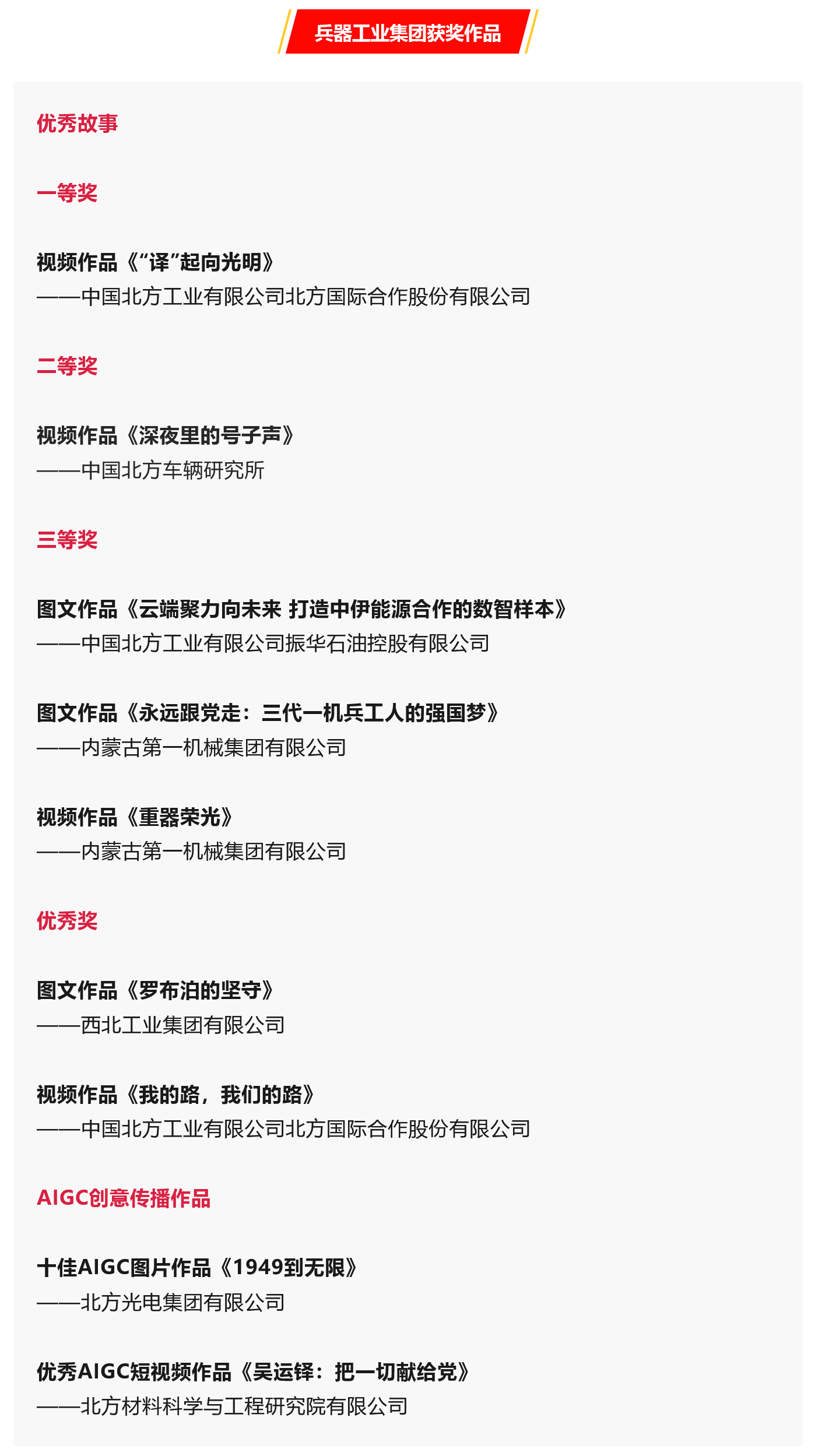 兵器工業(yè)集團9件作品在第七屆中央企業(yè)優(yōu)秀故事暨AIGC創(chuàng)意傳播作品發(fā)布展示活動中獲獎