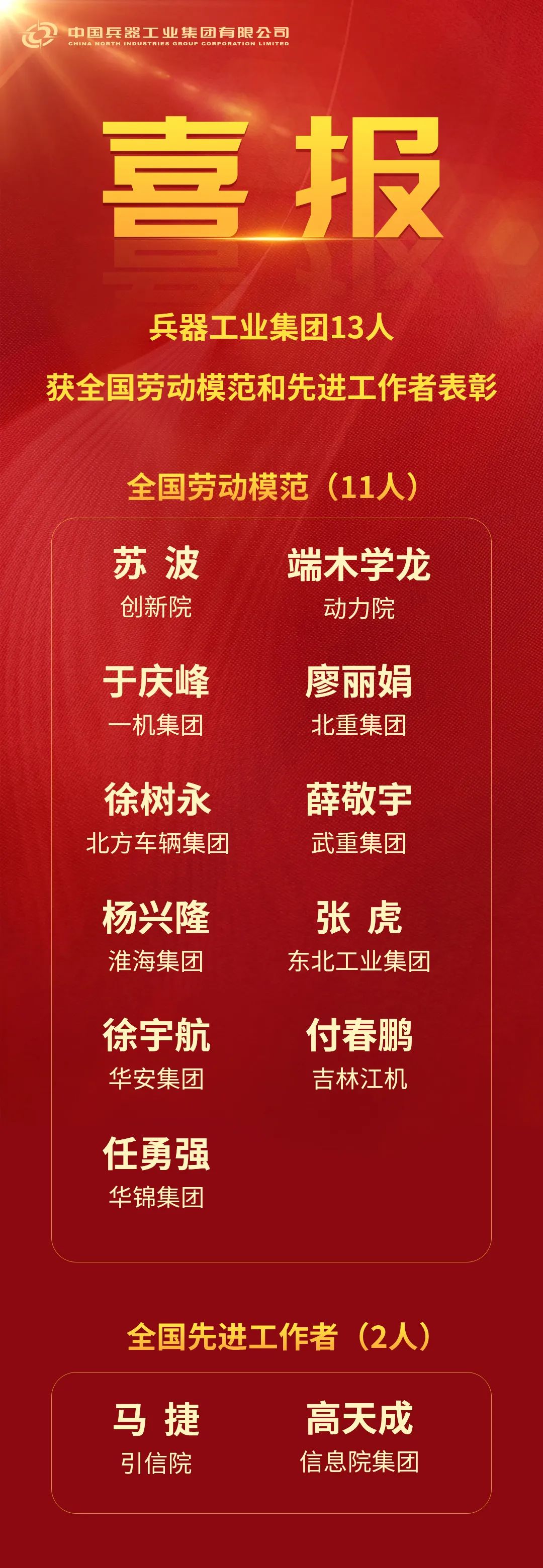 4月28日,慶祝中華全國總工會成立100周年暨全國勞動模范和先進工作者表彰大會在北京舉行,大會表彰了1670名全國勞動模范和756名全國先進工作者。中國兵器工業集團有限公司13人榮獲表彰,其中全國勞動模范11人、全國先進工作者2人。